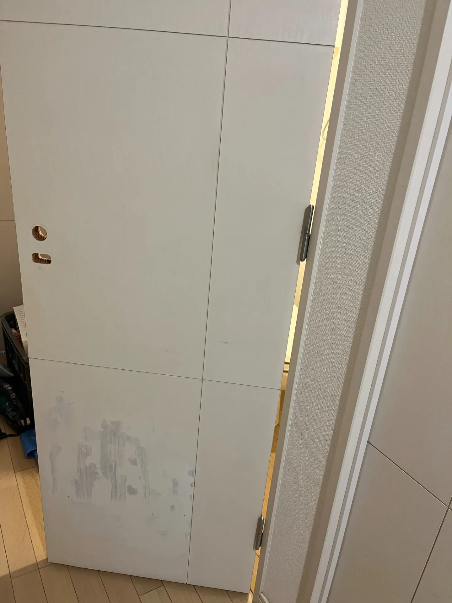 家具を移動中にドアに当たり、大きな穴が貫通してしまったと言う事例です。