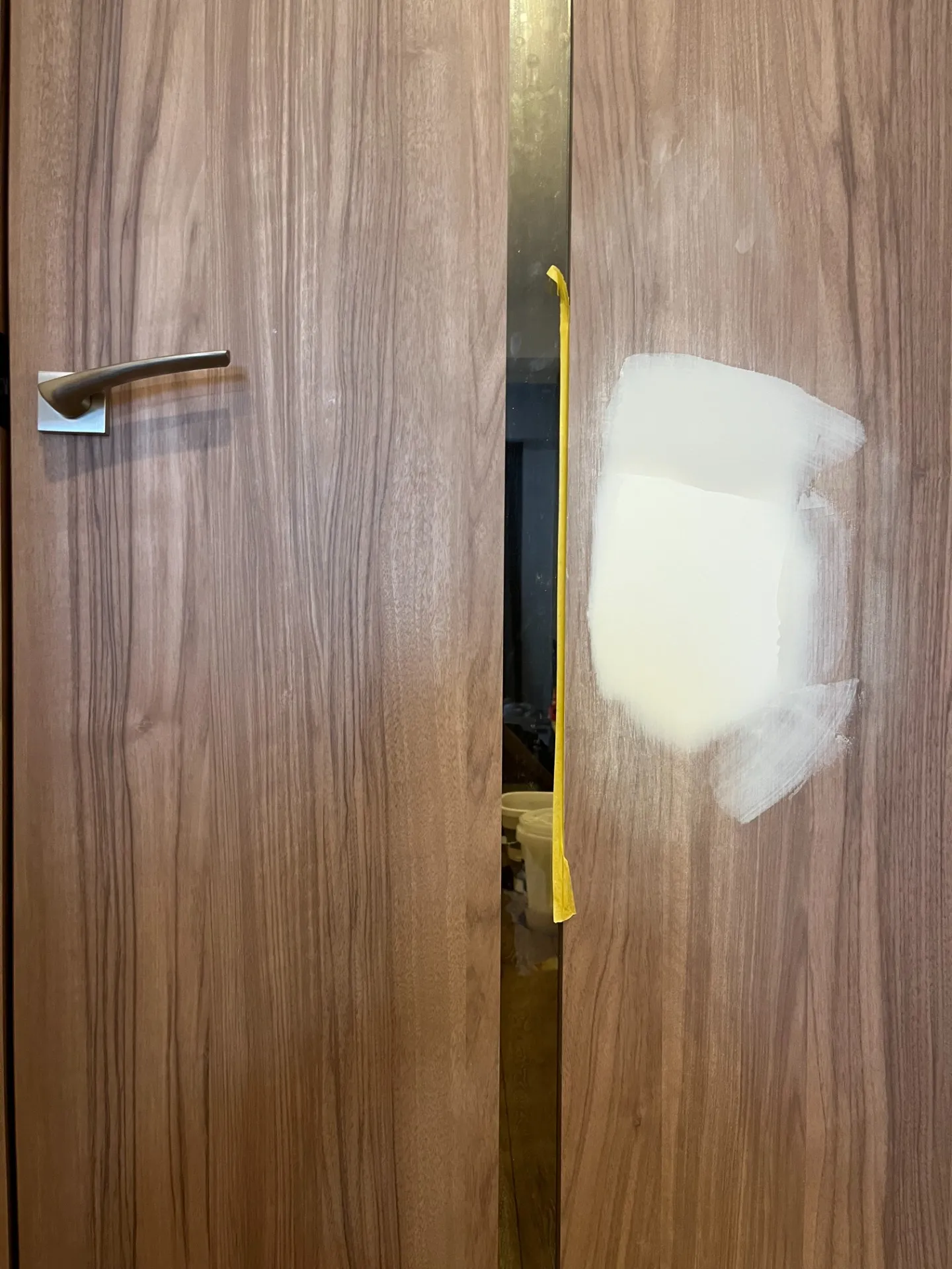 【東京都新宿区・マンション】リビングドアの大きな穴をリペア補修|木目調も美しく復元・3時間の短納期対応