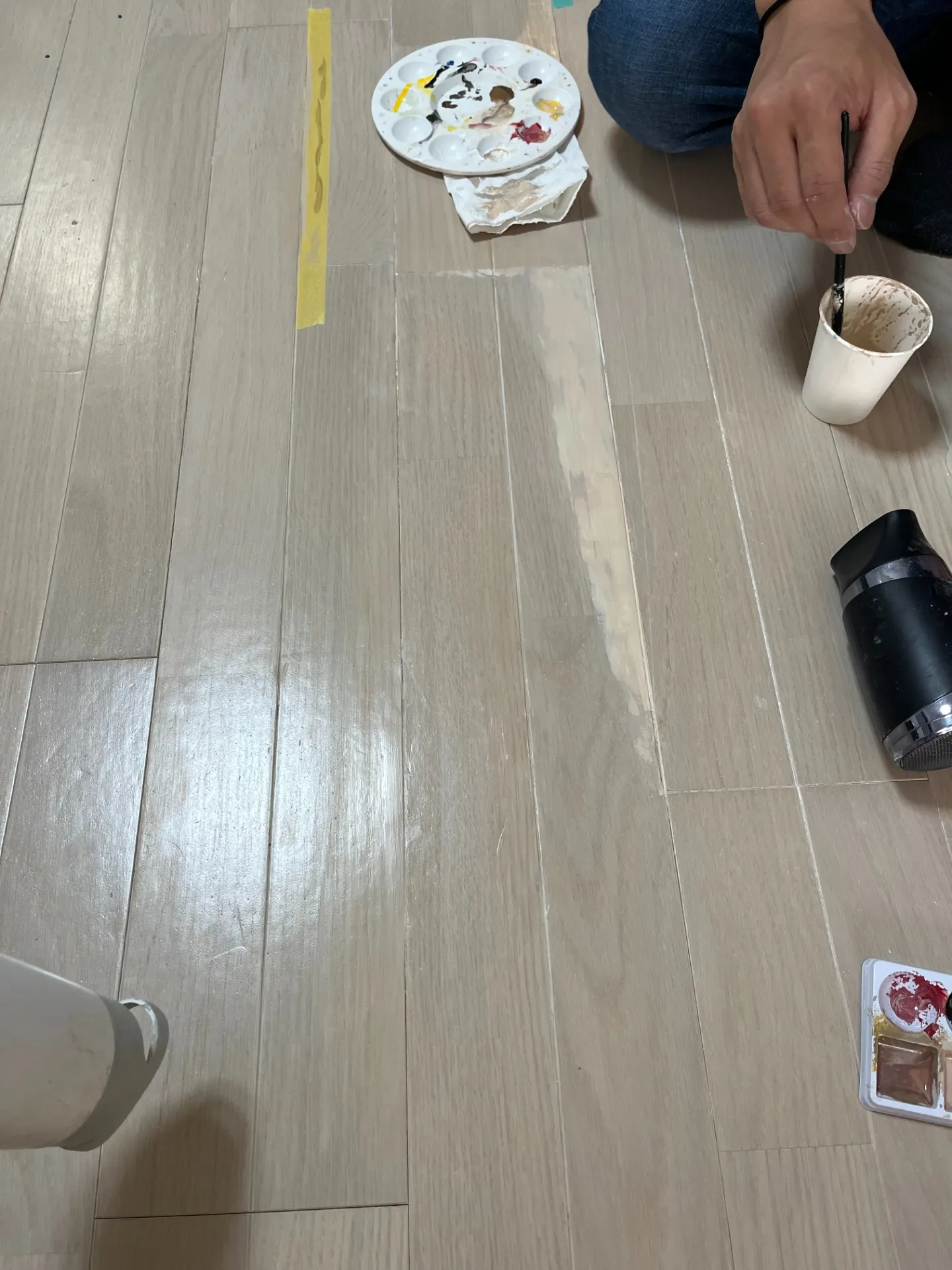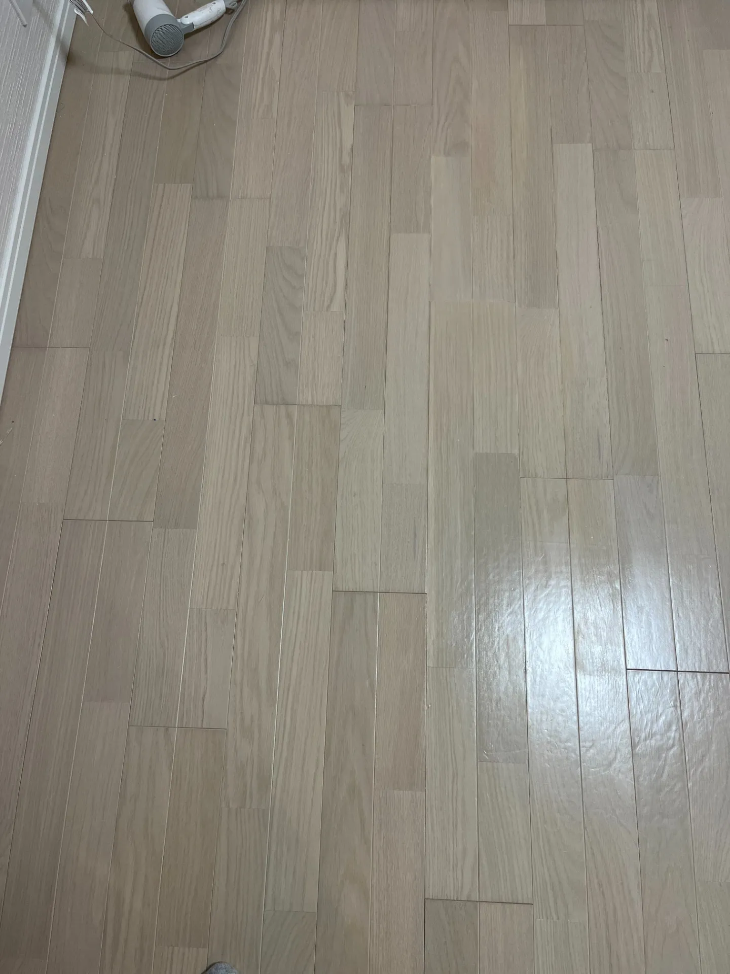 今回の施工では、広範囲に剥がれが発生している白系フローリングに対し、以下の方法で対応しました。