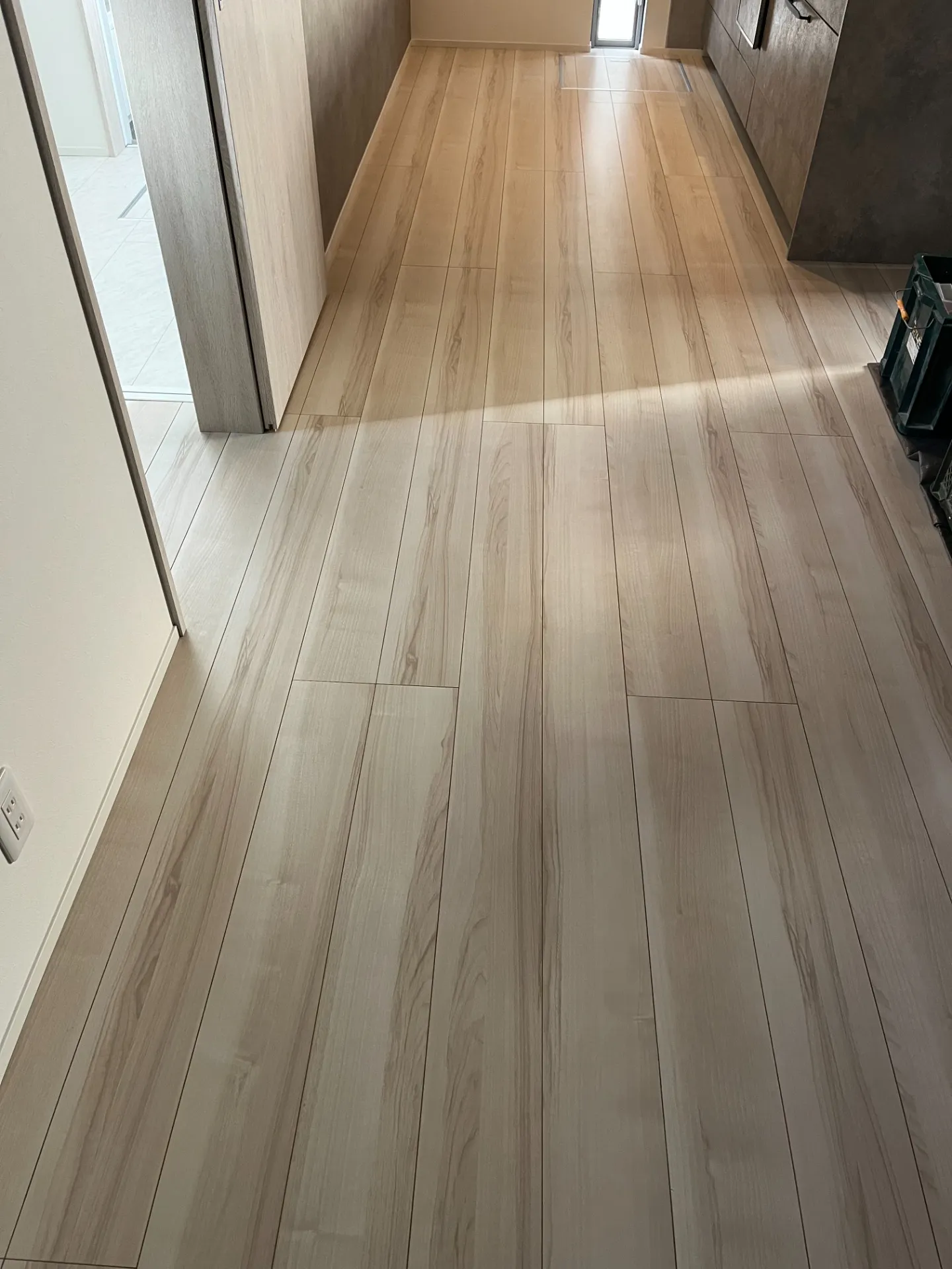 白系フローリングは色合わせが難しいですが、木目や色味を細かく再現することで、補修跡が目立たない状態に仕上げました。