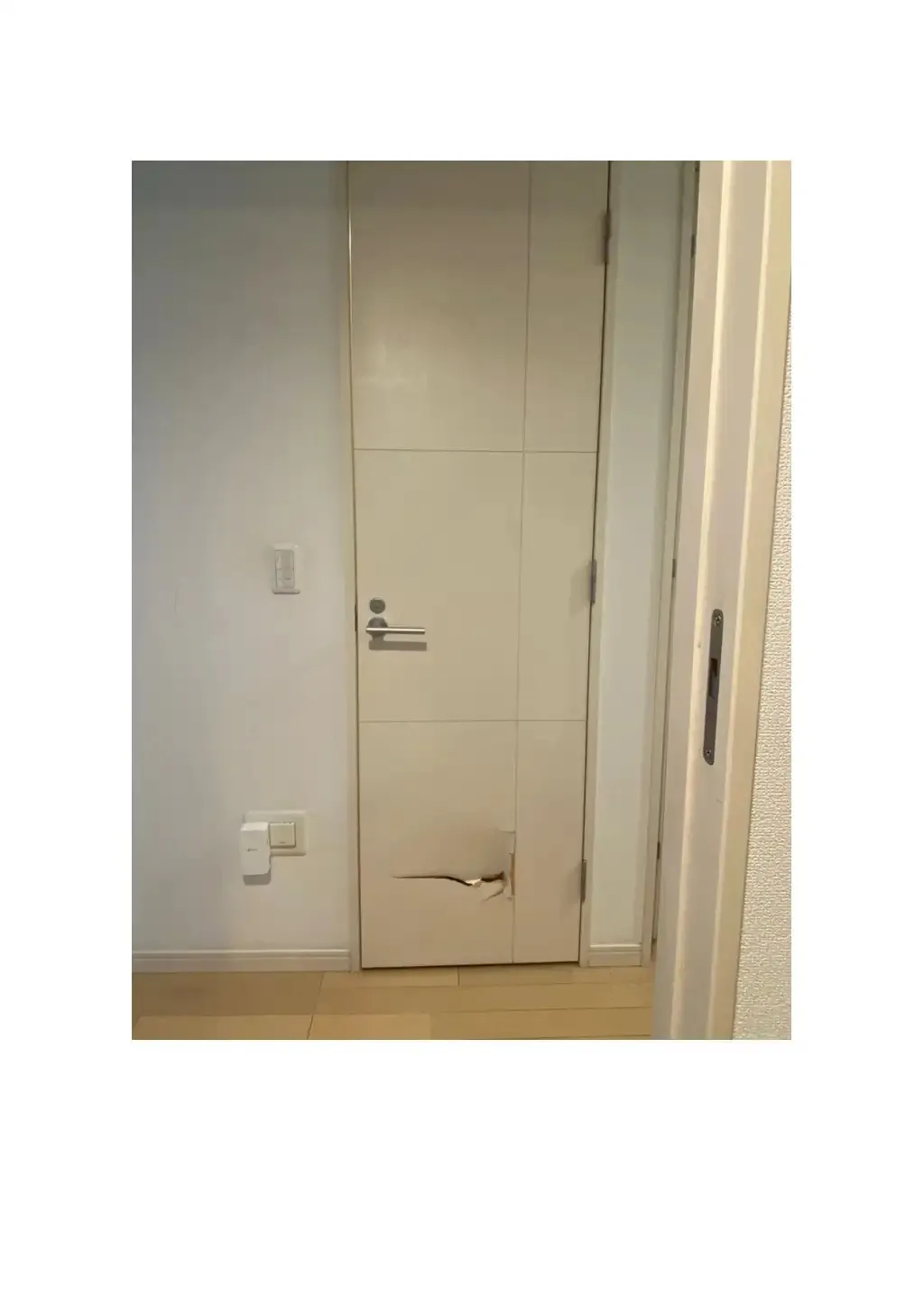 こんにちは、今回は埼玉県戸田市の賃貸住宅にお住まいの方からのご依頼です。寝室のドアの穴になりますが、引っ越し作業中に物をぶつけてしまったらしく火災保険を使っての補修になりました。塗装でも良…