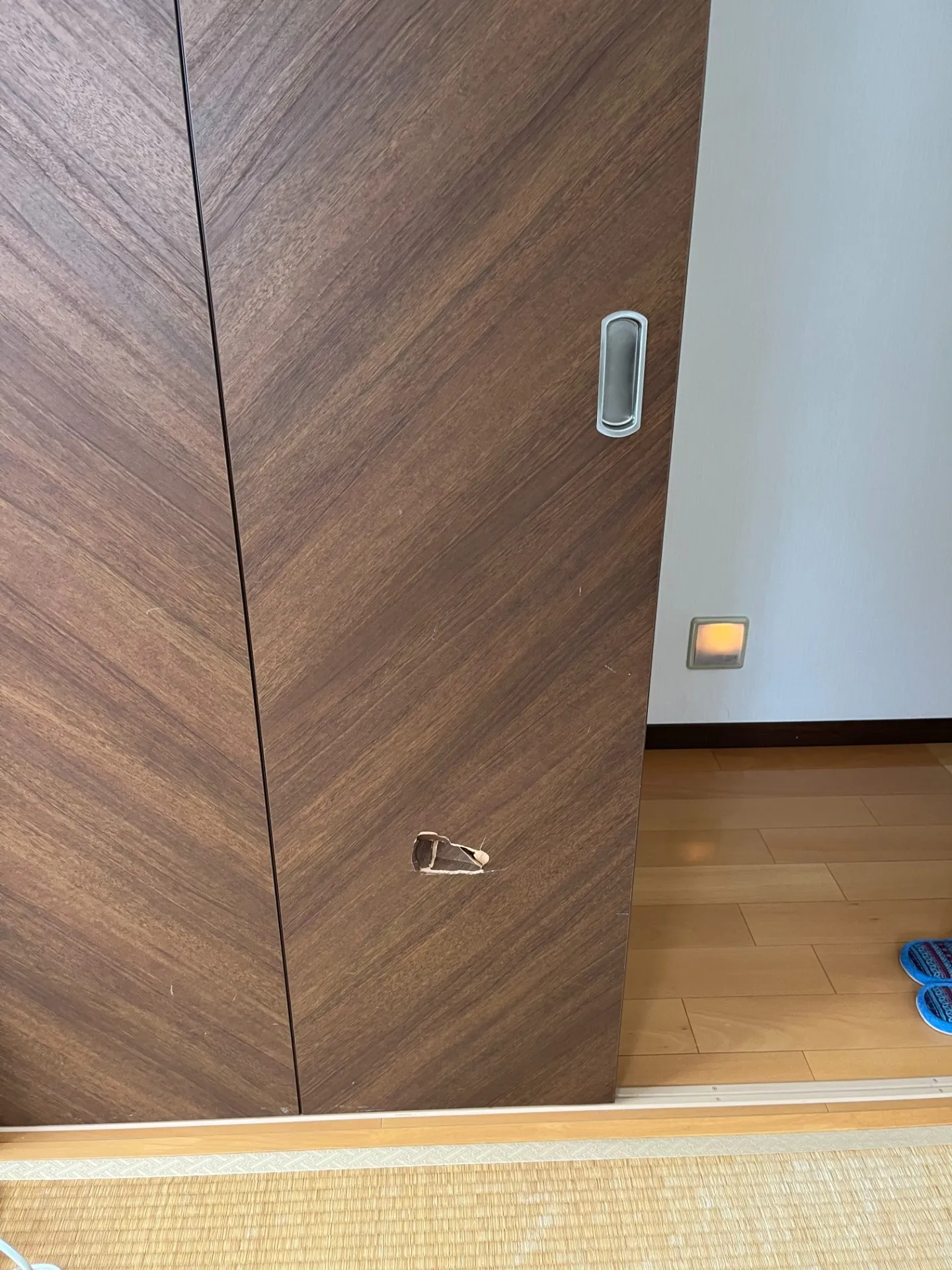 こんにちは、今回は埼玉県ふじみ野市の戸建て住宅にお住まいの方からドアの穴補修のご依頼です。木目が斜めに入っているので、ダイノックシートでの施工は出来ず穴を埋めた後、塗装での仕上げになりまし…